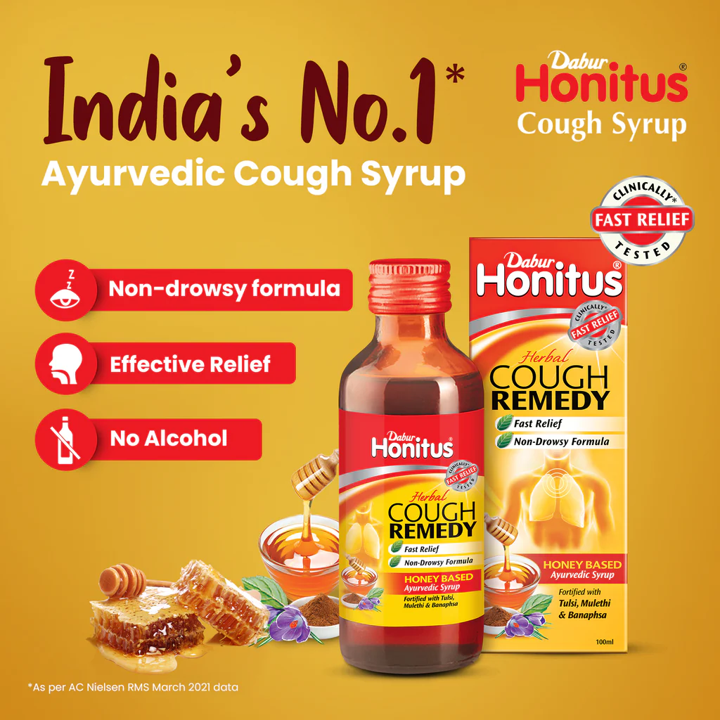 Dabur Honitus is India's No.1 Ayurvedic Cough Syrup. It is Clinically Tested for Fast & Effective Relief from Cough & Sore Throat in just 15 minutes. Its 100% Ayurvedic non-drowsy formula is made up of ingredients like Honey, Tulsi, Mulethi, Shunthi & Banapsha. It is safe to consume, does not contain any alcohol and is non-addictive.