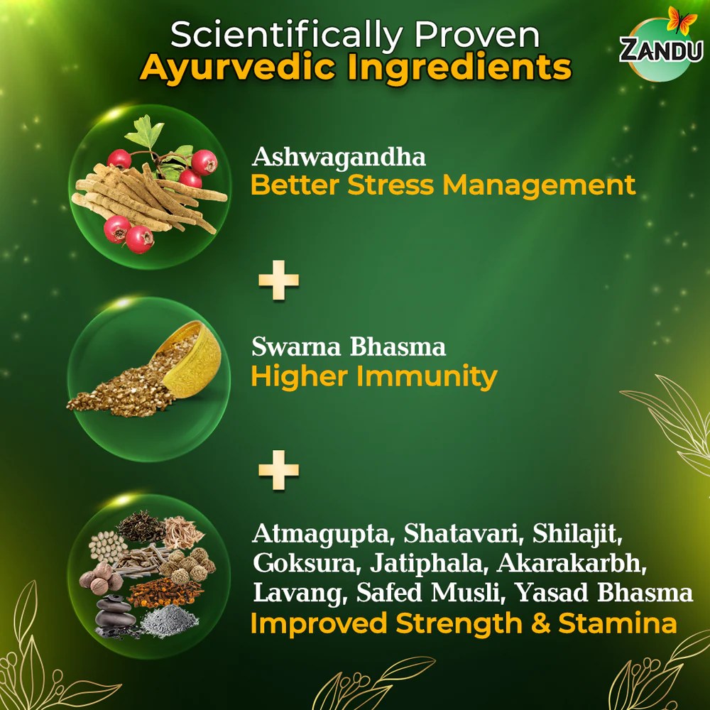 Reduce day-to-day stress and boost immunity with the extra gold of Zandu Ashwagandha Gold Plus capsules. These scientifically tested Ashwagandha Gold Capsules contain the goodness of 11 Ayurvedic herbs, including Ashwagandha, Swarna Bhasma (made from 24-karat gold), Gokshur, Shilajit, Shatavari, Jatiphala, and Lavanga. This powerful blend helps relieve stress, provide calmness, increase stamina, and enhance immunity.