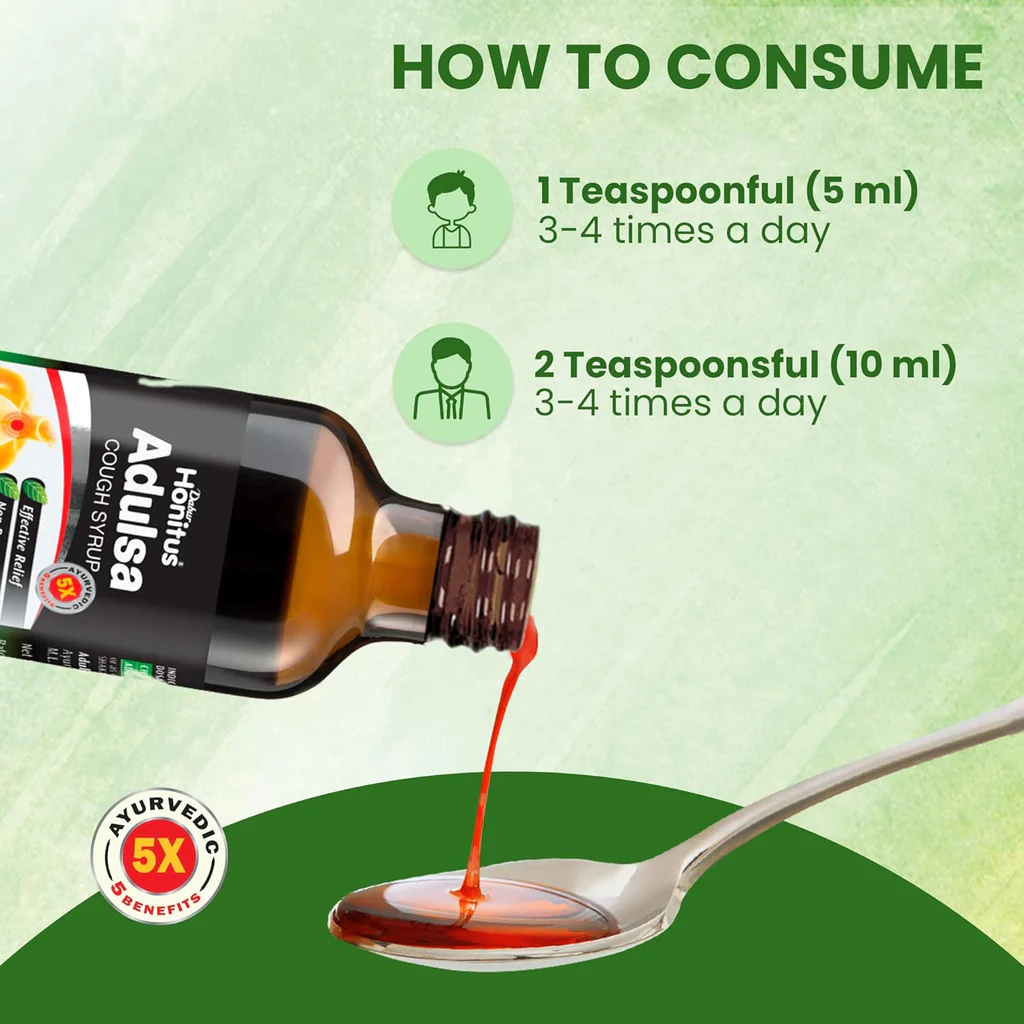 Dabur Honitus Adulsa Cough Syrup contains 2X power of Adulsa. Its ayurvedic non-drowsy formula provides effective relief from 5 types of problems like Cough, Cold, Sore Throat, Phlegm and Chest Congestion. It is enriched with the goodness of Adulsa, Honey, Mulethi, Tulsi, Kantakari and Haldi.