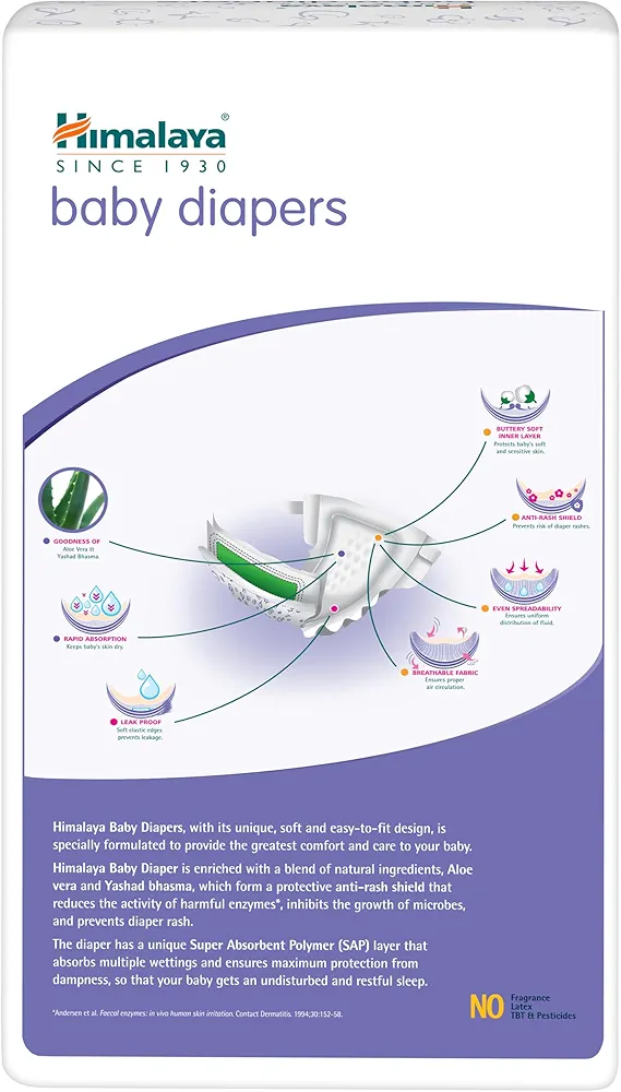 Himalaya Baby Diapers, with its unique, soft and easy-to-fit design, is specially formulated to provide the greatest comfort and care to your baby..Himalaya Baby Diaper is enriched with a blend of natural ingredients, Aloe Vera and Yashada bhasma, which form a protective anti-rash shield that reduces the activity of harmful enzymes, inhibits the growth of microbes, and prevents diaper rash.