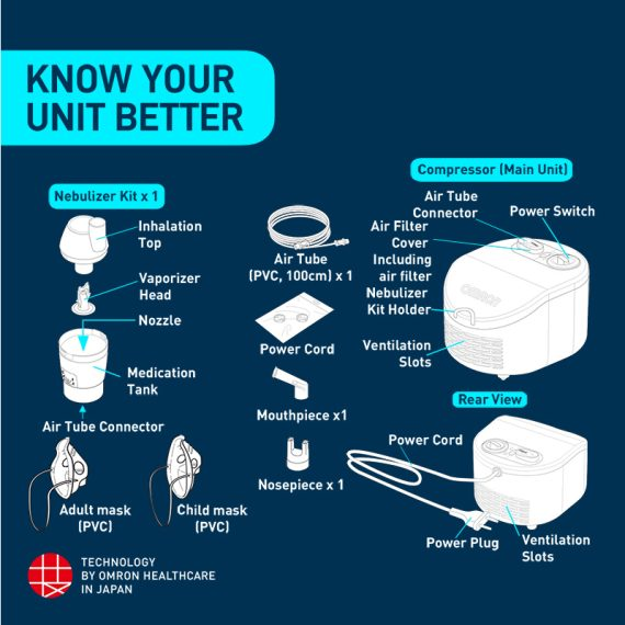 Net Quantity : 1 compressor nebulizer set (1 main unit, 1 nebulizer kit, 1 air tube (pvc, 100cm), 1 mouthpiece, 1 nosepiece, 1 adult mask (pvc), 1 child mask (pvc), 2 spare air filters, 1 instruction manual, 1 quick start guide)