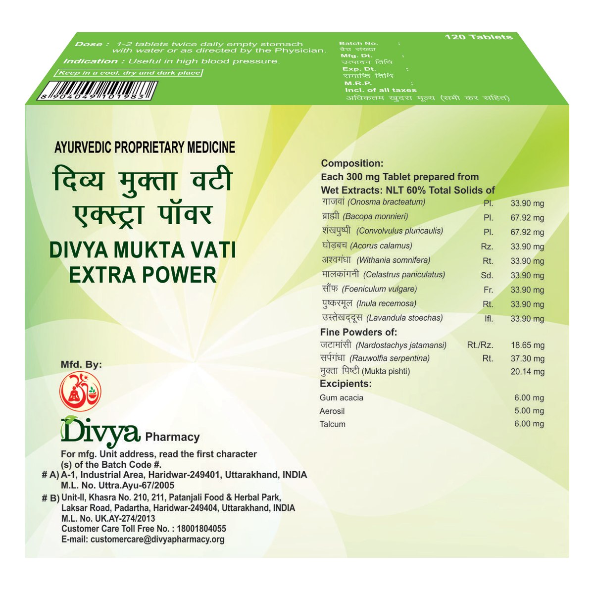 Patanjali Divya Mukta Vati Extra Power is an Ayurvedic proprietary medicine formulated to help manage cardiovascular health. The tablets contain a blend of herbal extracts. It is a light to dark brown, round biconvex film-coated tablet with a characteristic odour.