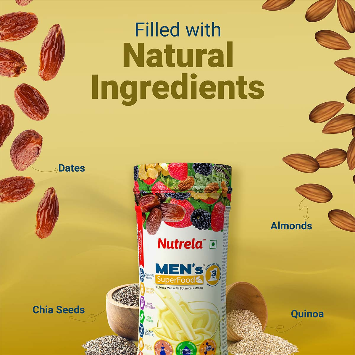 Patanjali Nutrela Men's Superfood is a vegetarian blend of protein, prebiotic, malt extract powder and 7 botanical extracts. This superfood is designed to help men, maintain an active and healthy lifestyle by providing essential nutrients and energy, ensuring men’s daily nutrition needs are met without compromise.