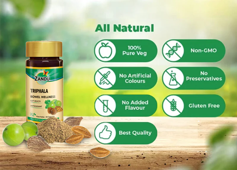 Apart from relieving digestive issues, Triphala also contains essential antioxidants that improve skin, eye, and hair health. Zandu Triphala capsules are developed by ZAARC (Zandu Advanced Ayurvedic Research Center) and carry the 100-year legacy and trust of Zandu. Additionally, they do not contain any harmful chemicals or added flavours.